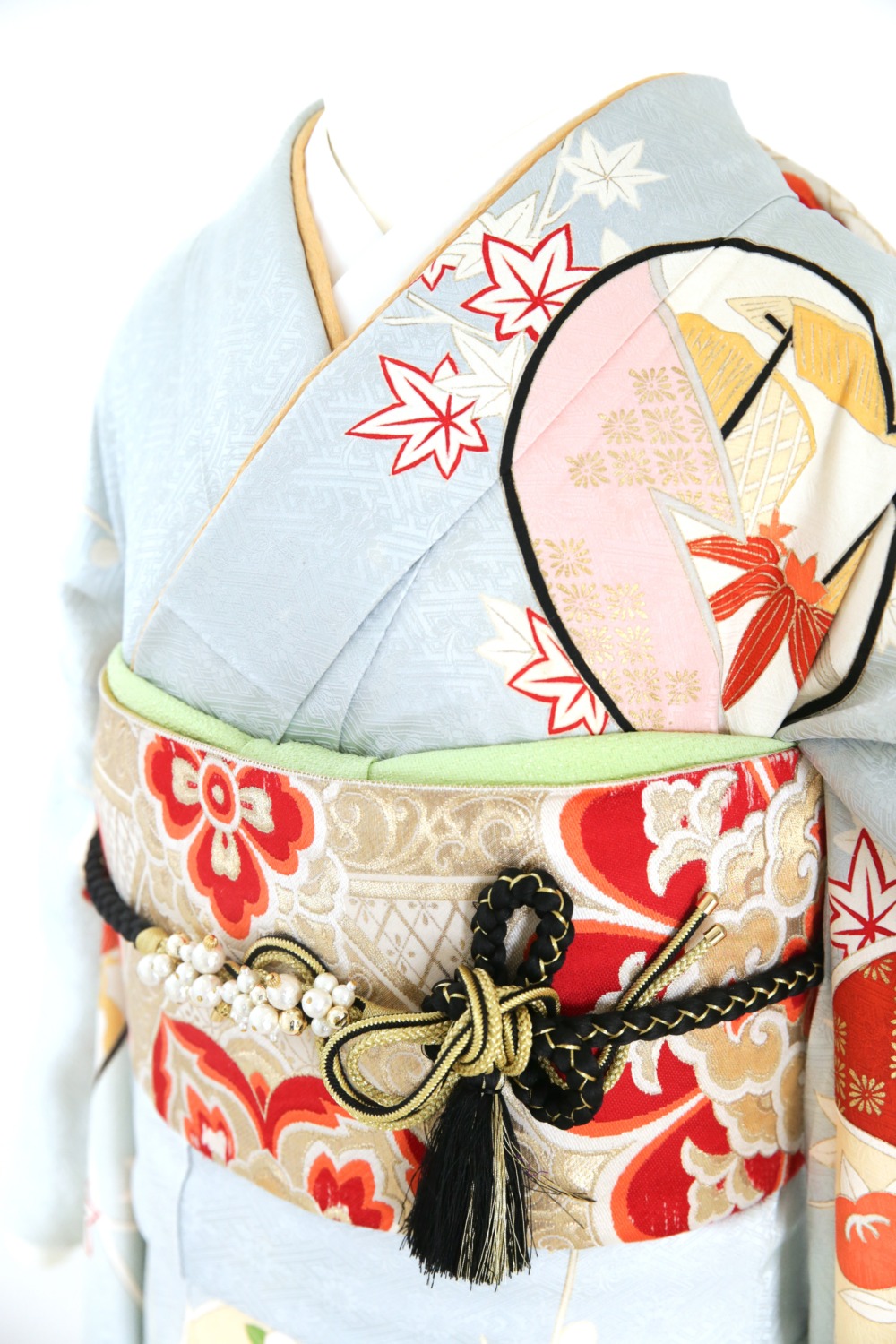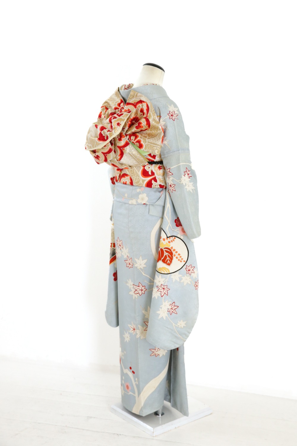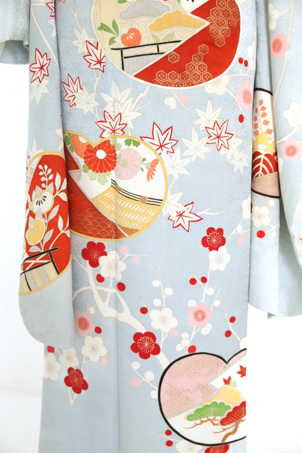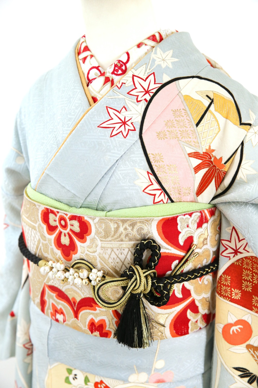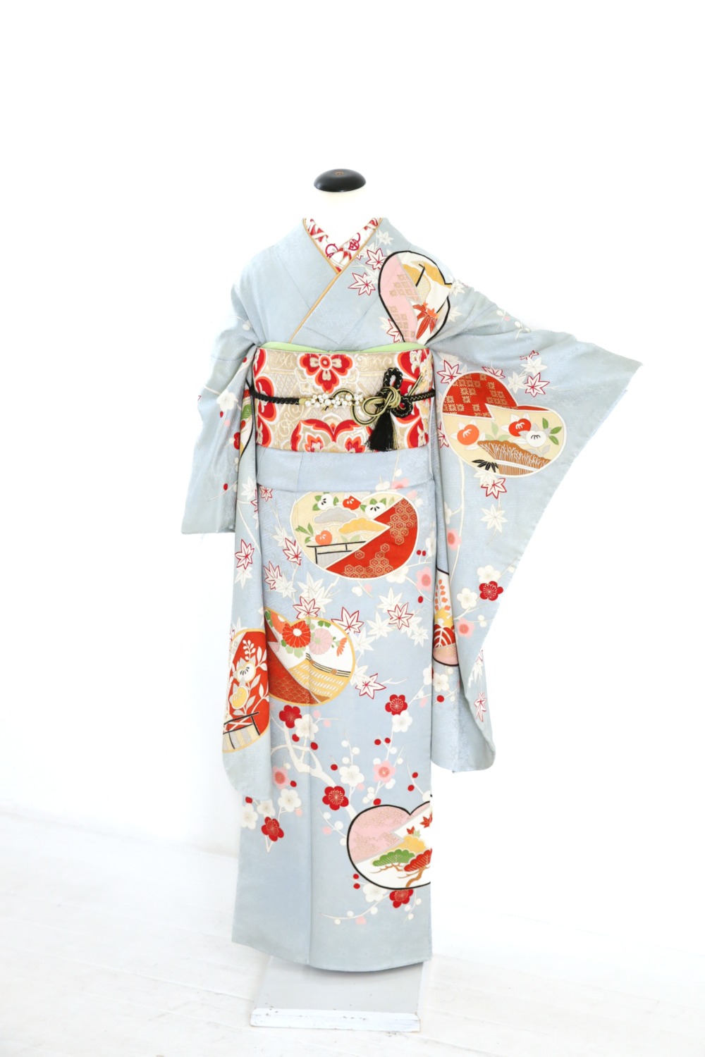 薄青地梅松振袖 カテゴリー:成人式振袖レンタルカタログ青・水色系 【FPK2-6】薄青地梅松振袖 成人式レンタルコーディネート一式基本料金:¥105,000(税込¥115,500) サイズ:身丈(肩から)162cm/裄65cm/袖丈94cm/S~Mサイズ