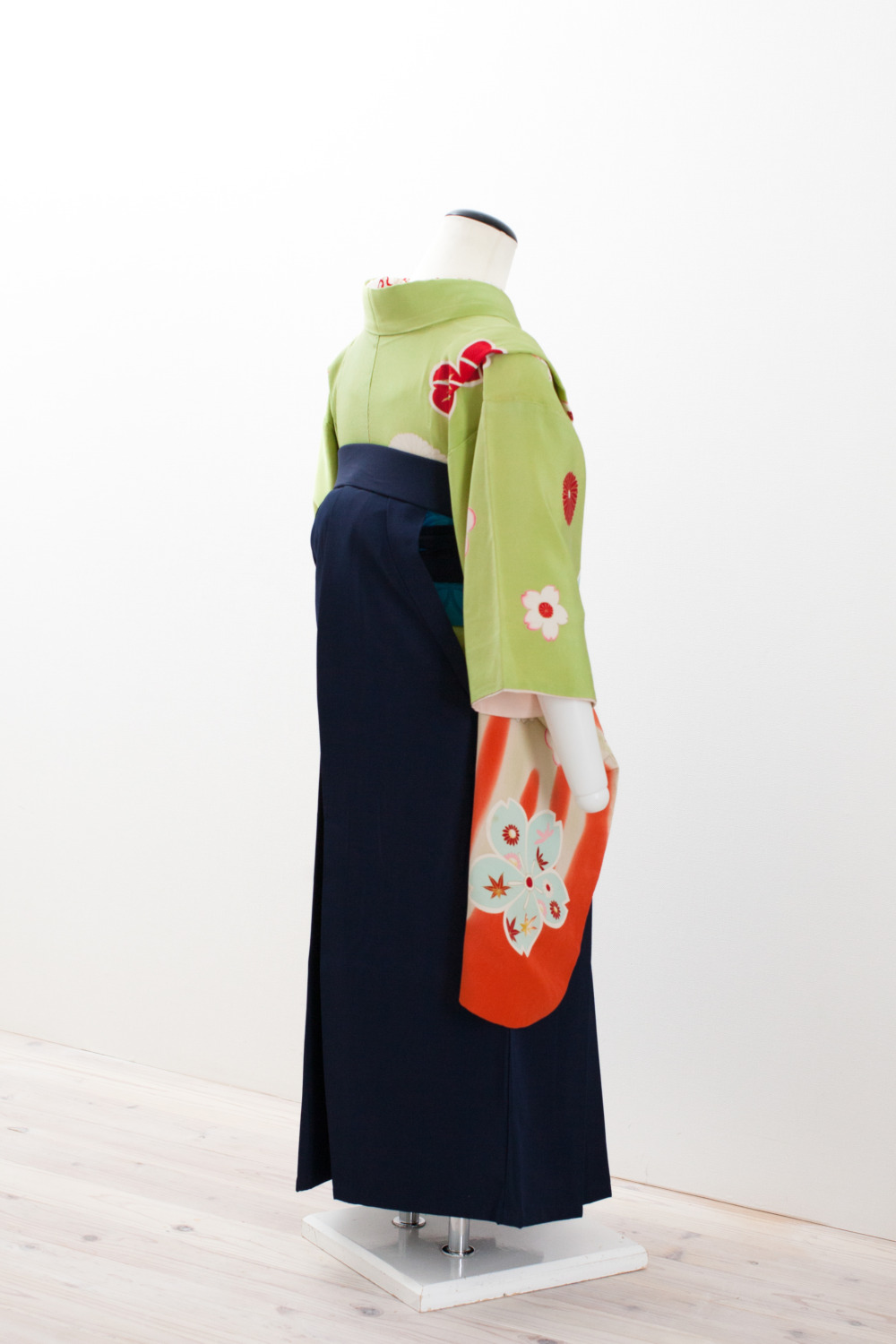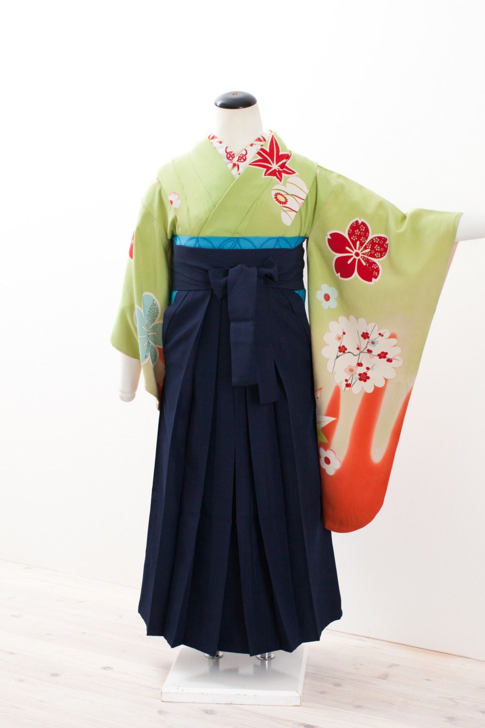 黄緑地梅に紅葉アンティーク カテゴリー:小学生 きもの:黄緑地梅に紅葉中振袖【HYE1-3】 袴:紺(ジュニアサイズ) 帯:青 レンタル基本料金:¥55,000(税込¥60,500) 半衿:刺繍半衿 オプション料金:¥3,000(税込¥3,300)