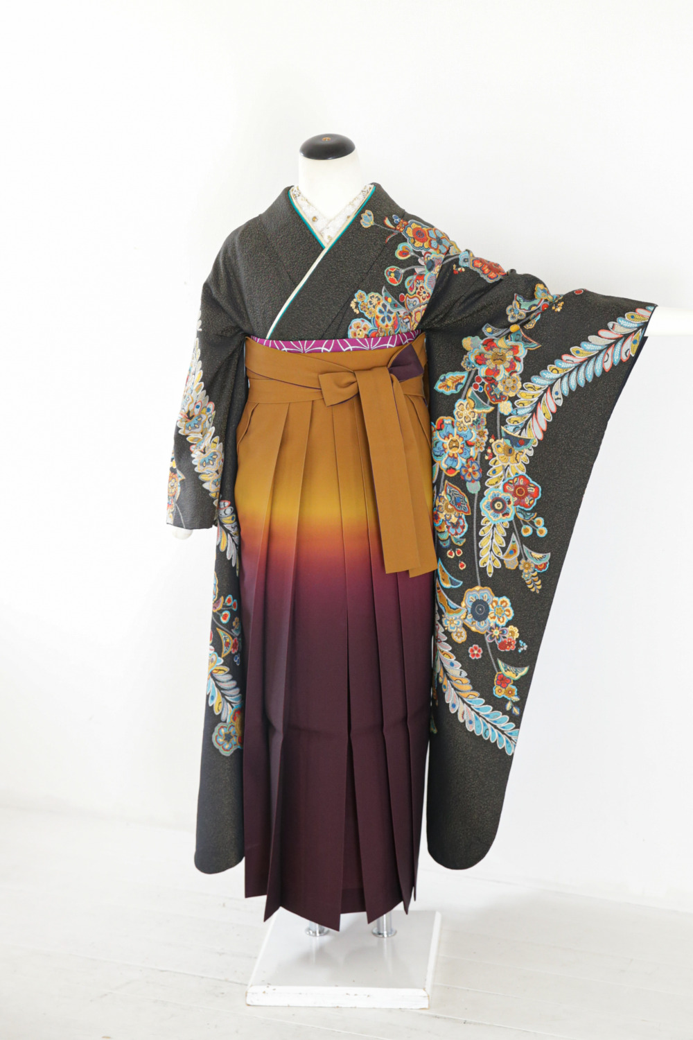 黒地花つらね振袖 カテゴリー:学生卒業式袴レンタルカタログ きもの:黒地花つらね振袖【FOR2-6】 裄:66cm 袖丈:106cm サイズ目安:M~ レンタル基本料金:¥65,000(税込¥71,500) ※刺繍半衿は、オプション料金要