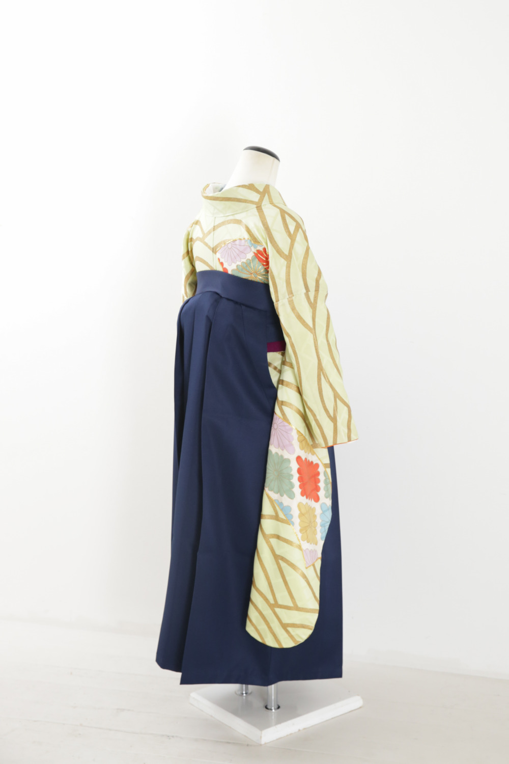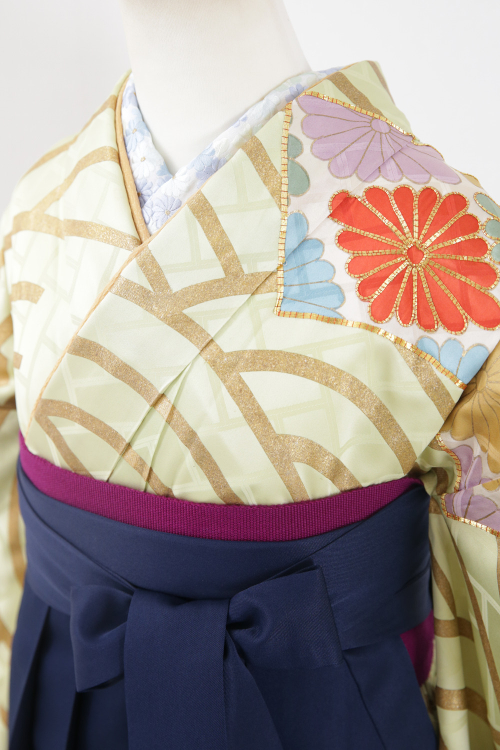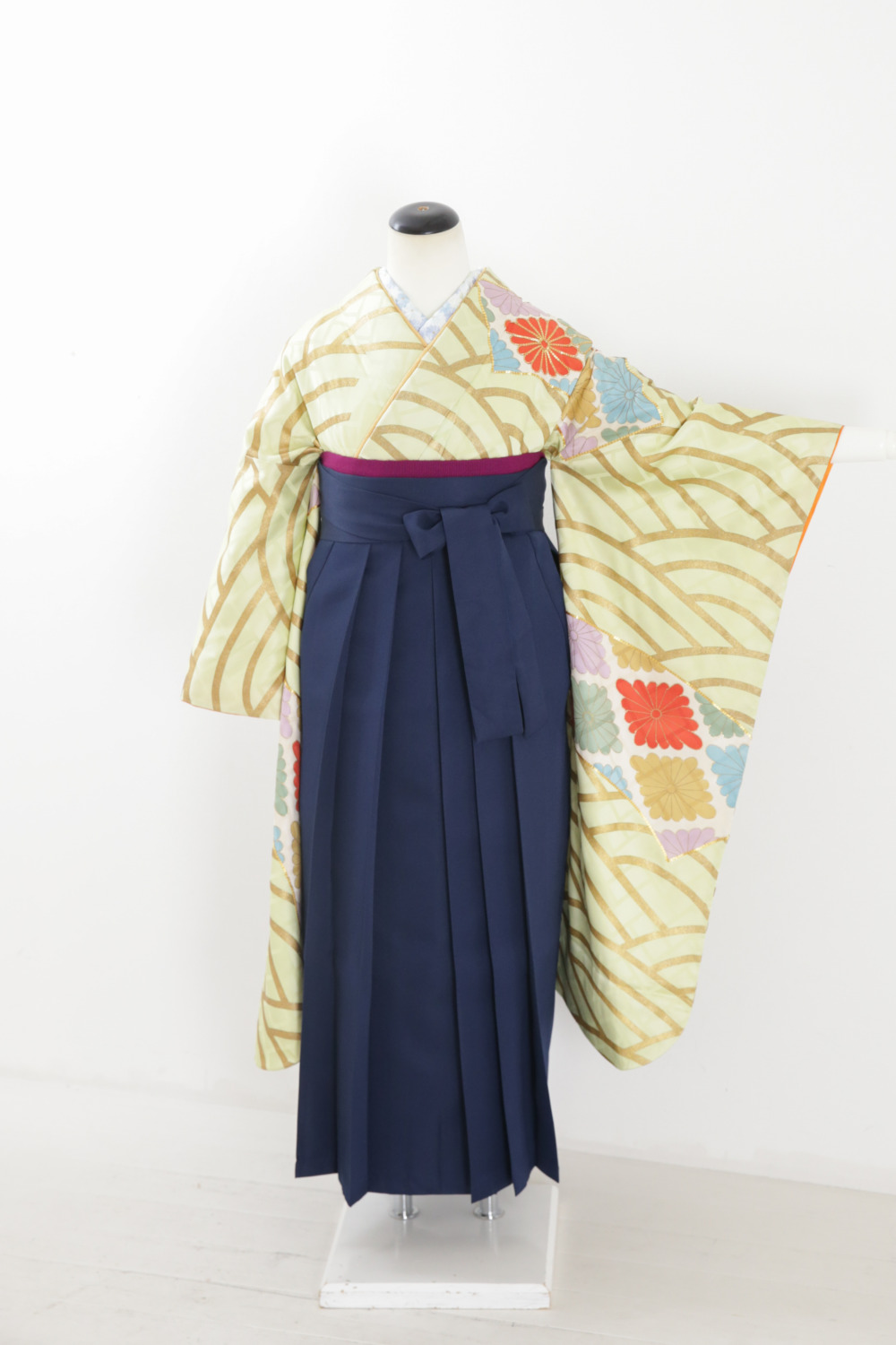 黄緑地金青海波振袖 カテゴリー:学生卒業式袴レンタルカタログ きもの:黄緑地金青海振袖【FPA3-2】 裄:68cm 袖丈:92cm サイズ目安:S~LL レンタル基本料金:¥71,500(税込) ※刺繍半衿は、オプション料金要