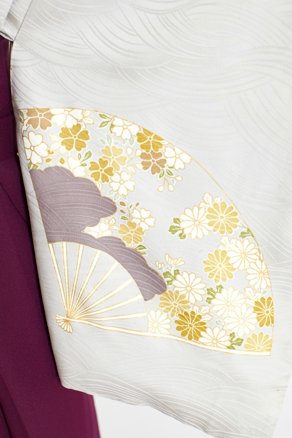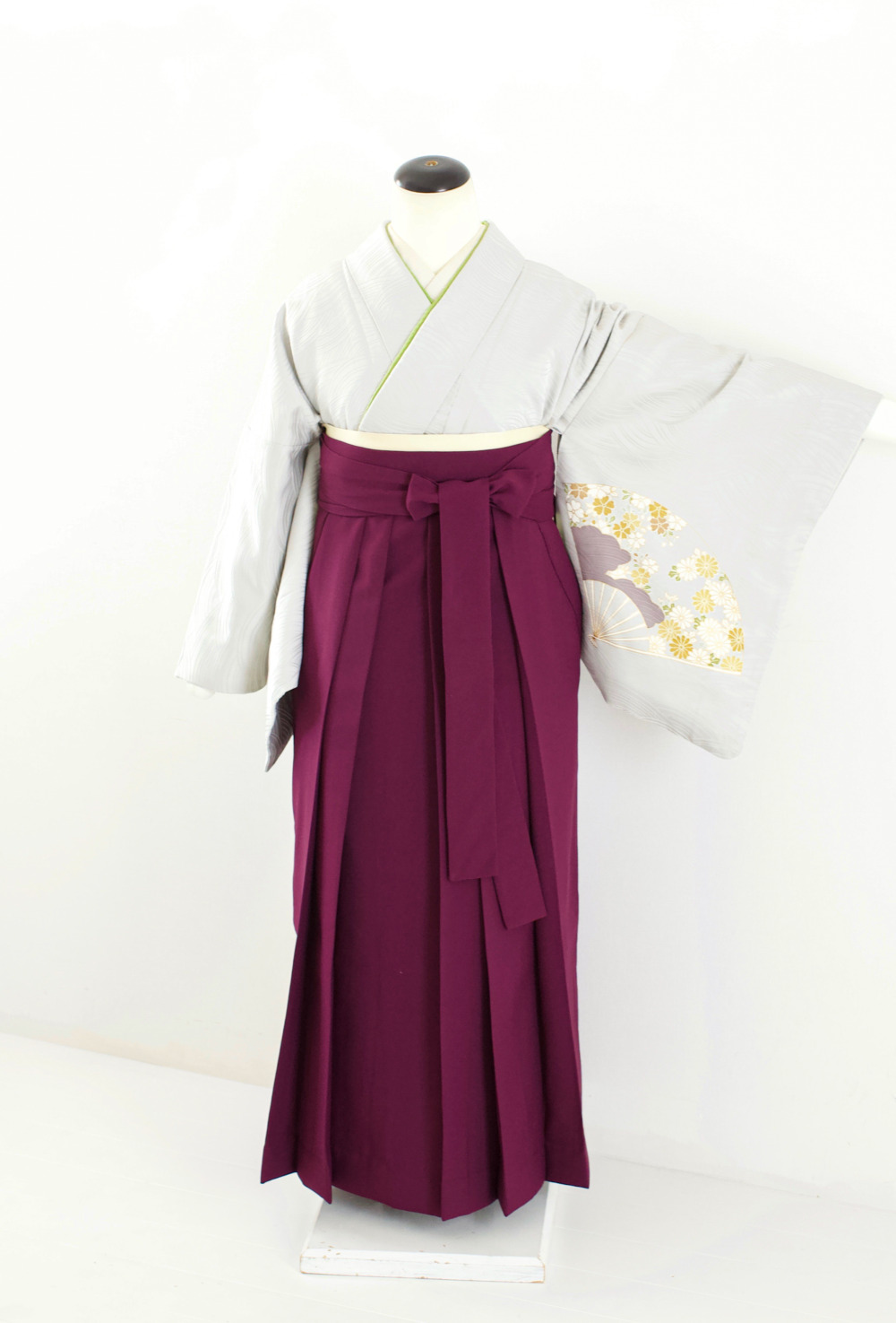 グレー扇訪問着 カテゴリー:教員・先生卒業式袴レンタルカタログ きもの:グレー扇【HPA4-3】 裄:66cm 袖丈:49cm サイズ目安:M 袴:紫(M・L) 帯:クリーム系 レンタル基本料金:¥44,000(税込)