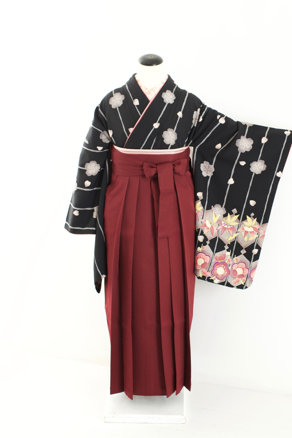 黒さくら柄中振袖 カテゴリー:学生小学生卒業式袴レンタルカタログ きもの:黒さくら柄中振袖【HYE3-4】 裄:68cm 袖丈:65cm サイズ目安:M~L※小学生は肩揚げします。 袴:エンジ(S・M・L) 帯:ピンク系 レンタル基本料金:¥60,500(税込) オプション刺繍半衿:¥3,300(税込)
