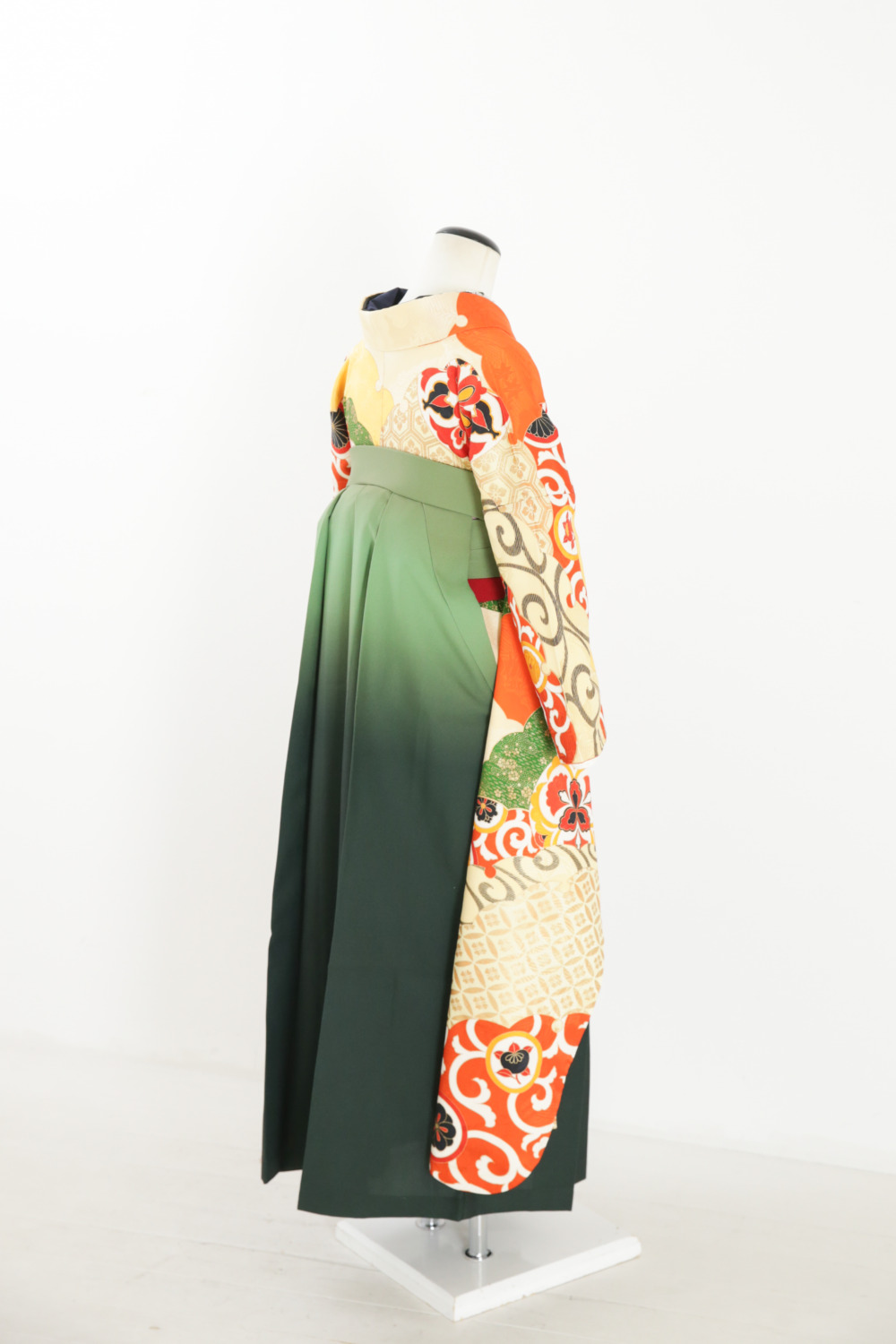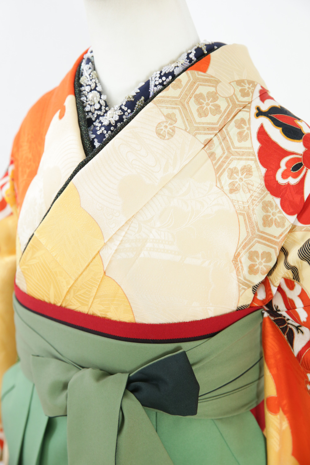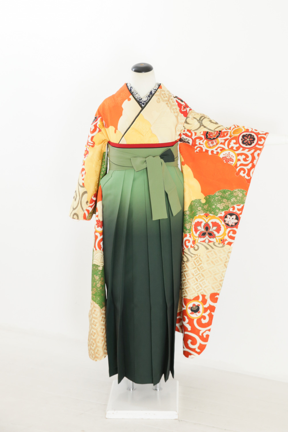 オレンジ雪輪に唐花柄振袖 カテゴリー:学生卒業式袴レンタルカタログ きもの:オレンジ雪輪に唐草柄振袖【FGR2-1】 裄:65.5cm 袖丈:106cm サイズ目安:M 袴:茶色(M) 帯:紺系 レンタル基本料金:¥71,500(税込)