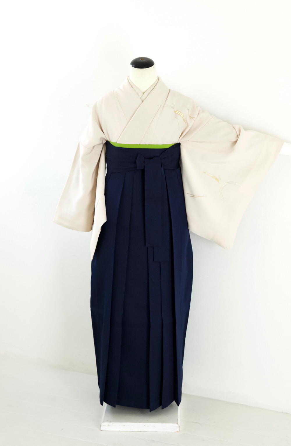 ベージュ地笹柄付下げ カテゴリー:教員・先生卒業式袴レンタルカタログ きもの:ベージュ地笹柄付下げ【HGR3-2】 裄:67.5cm 袖丈:49cm サイズ目安:M~L 袴:紺(S、M、L、LL) 帯:黄緑系 レンタル基本料金:¥32,000(税込¥35,200)