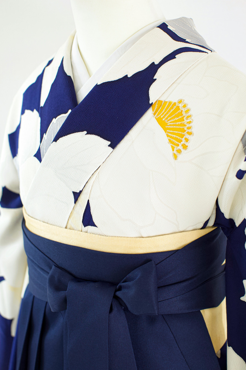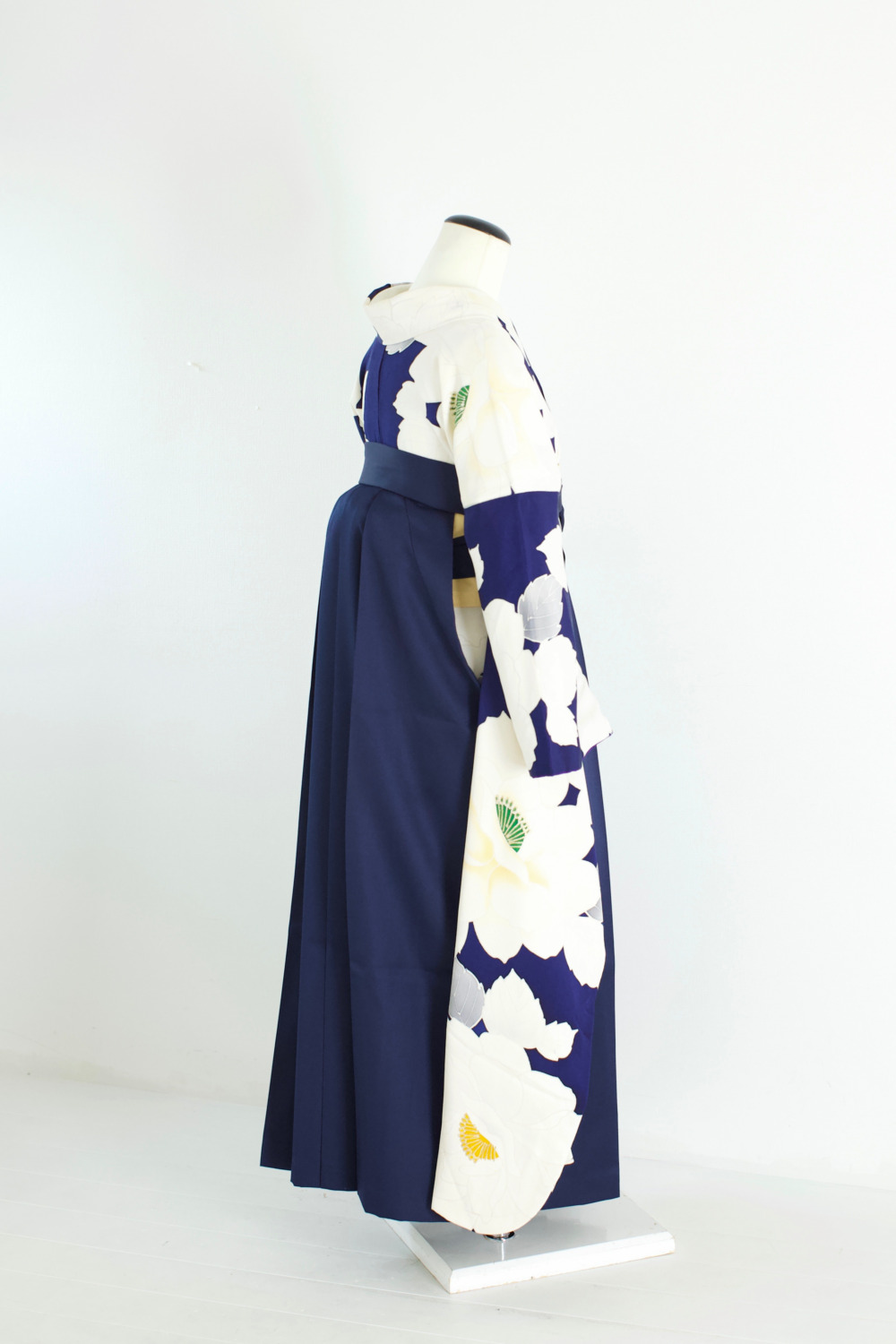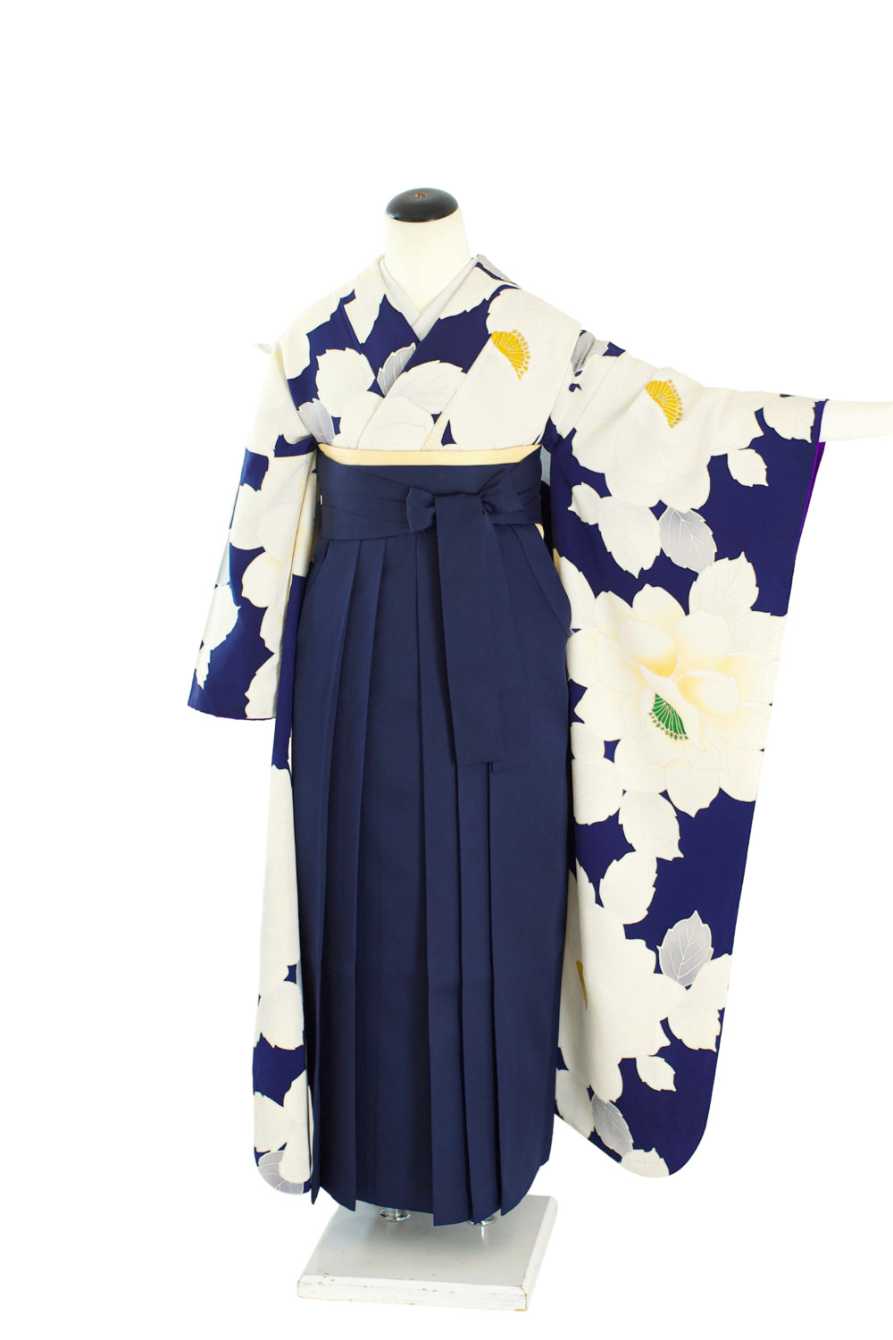 紺地白花振袖 カテゴリー:学生卒業式袴レンタルカタログ きもの:紺地白花振袖【FOR3-7】 裄:69cm 袖丈:108cm サイズ目安:L~LL 袴:紺(S/M/L/LL) 帯:イエロー系 レンタル基本料金:¥65,000(税込¥71,500)