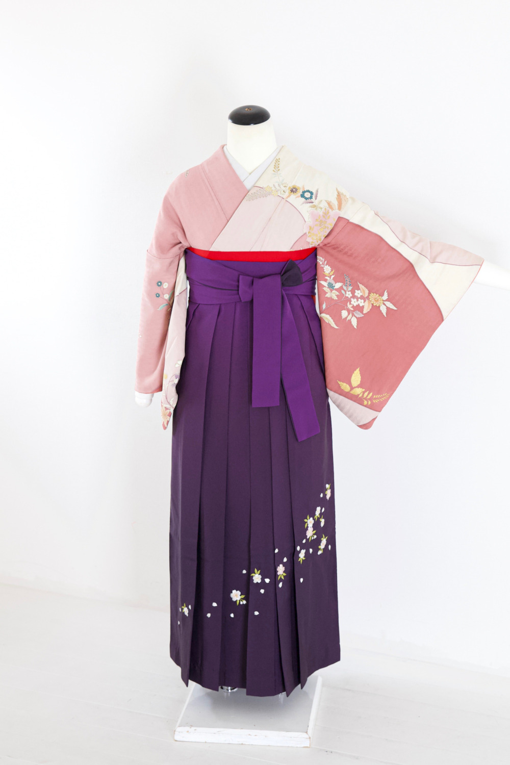 ピンク地洋花訪問着(B) カテゴリー:教員・先生卒業式袴レンタルカタログ きもの:ピンク洋花訪問着 裄:65cm 袖丈:48cm サイズ目安:S~M 袴:紫袴刺繍あり(M) 帯:赤系 レンタル基本料金:¥32,000(税込¥35,200)