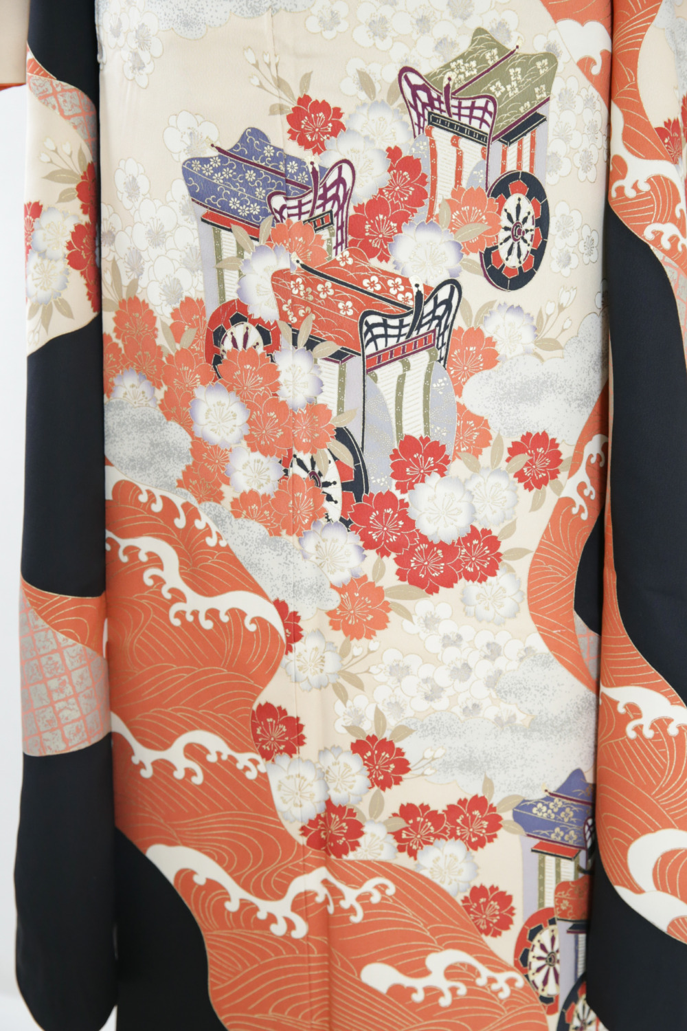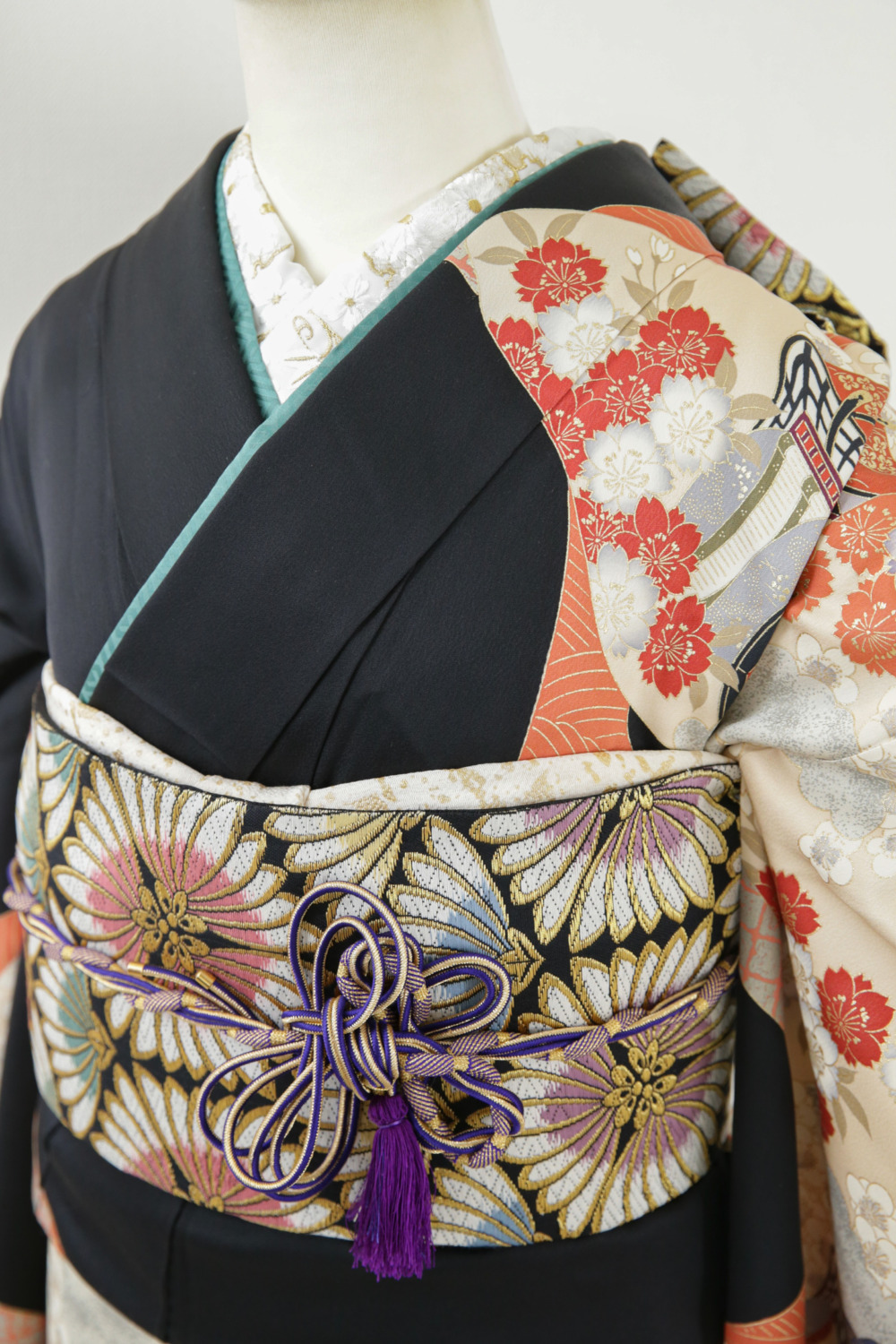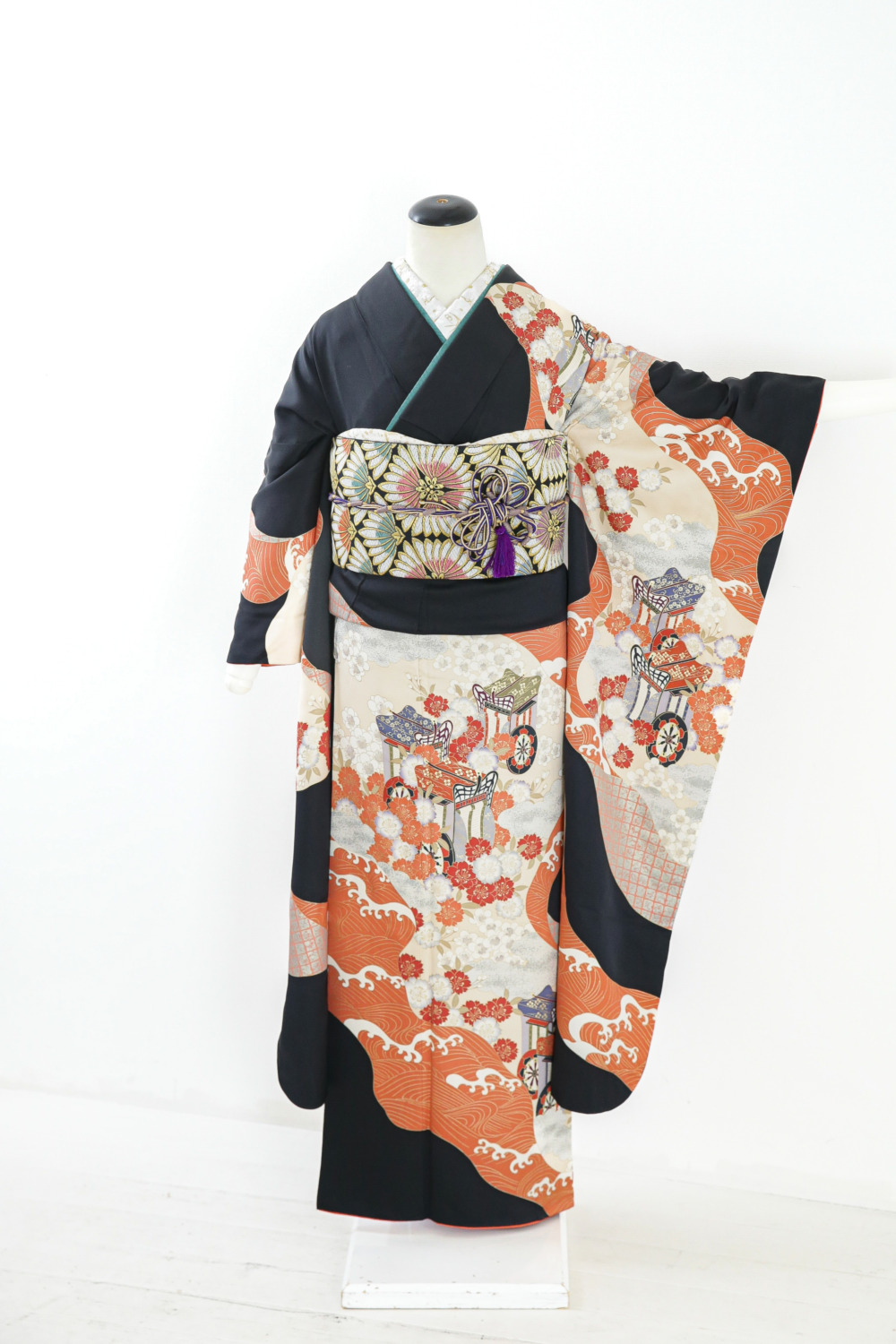 黒地御所車 カテゴリー:成人式振袖レンタルカタログ黒系 きもの:黒地御所車 サイズ:身丈(肩から)161cm/裄66cm/袖丈106cm/M~Lサイズ 成人式レンタルコーディネート一式基本料金:¥135,000(税込¥148,500)