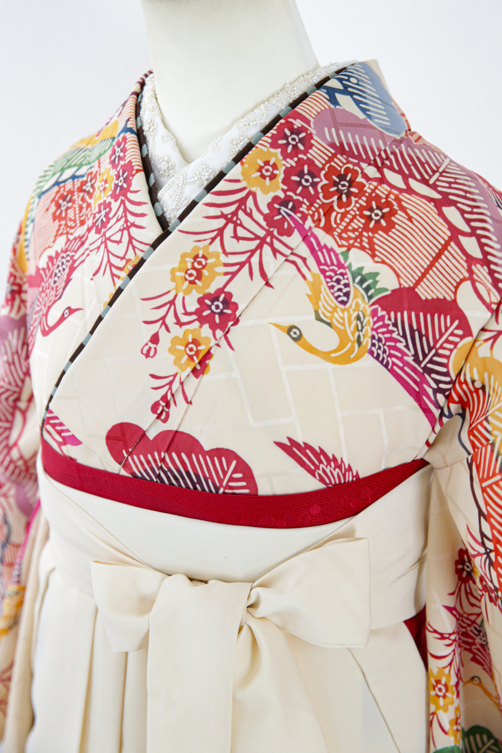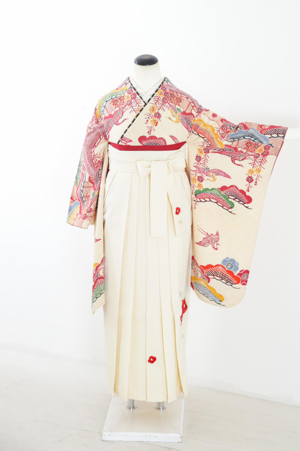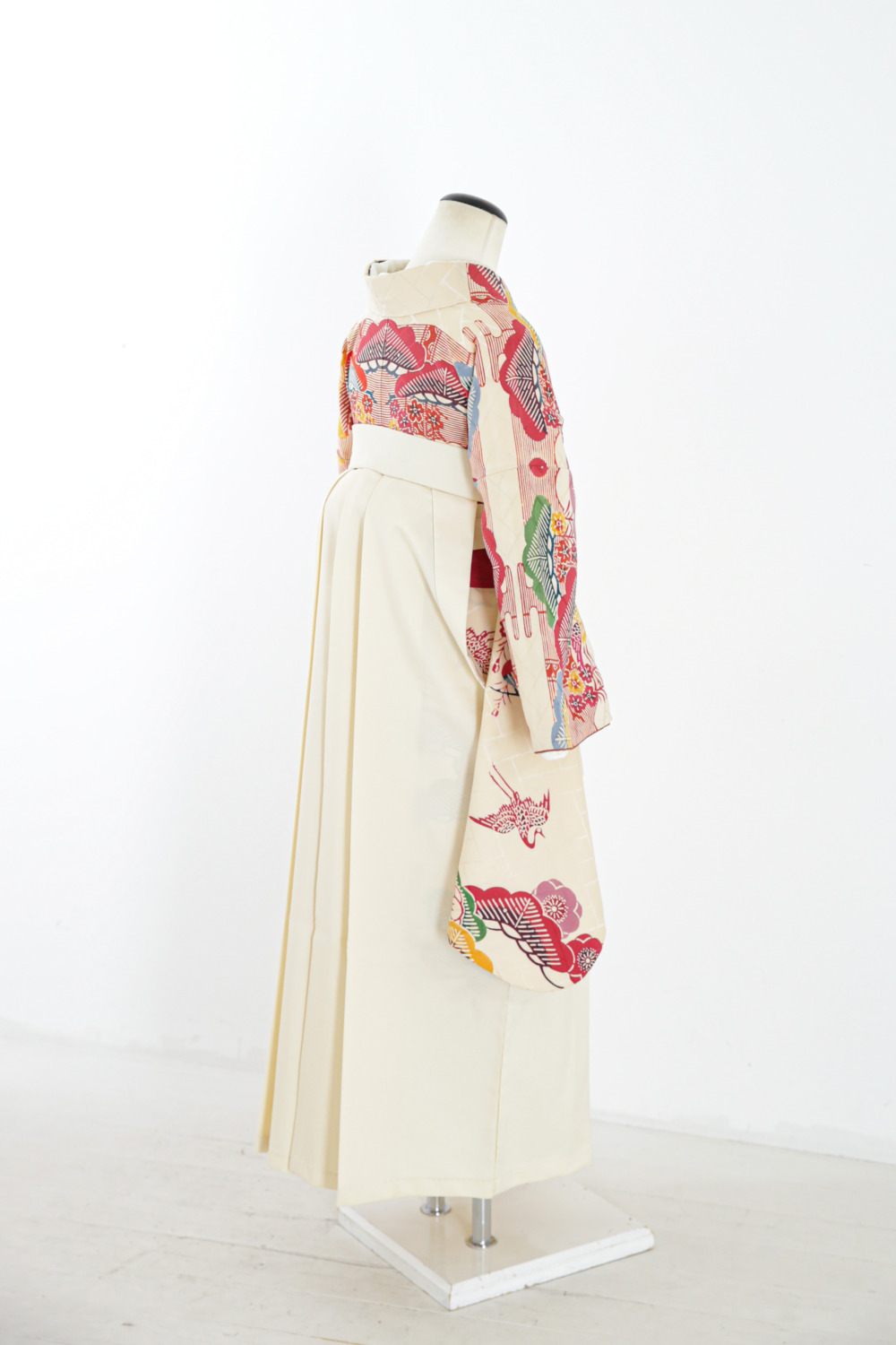 ベージュ地紅型中振袖〈B〉 カテゴリー:学生小学生卒業式袴レンタルカタログ きもの:ベージュ地紅型中振袖【HYE3-1】 裄:66.5cm 袖丈:75.5cm サイズ目安:M 袴:白に刺繍 帯:赤系 レンタル基本料金:¥60,500(税込)