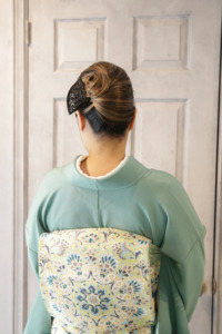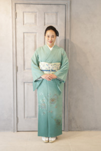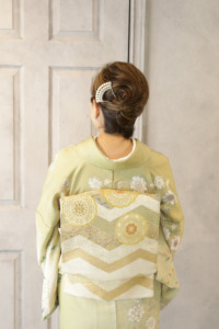 雰囲気の違ったグリーン地のお着物をそれぞれお選びに^^お二人並ばれた姿が大変素敵です!